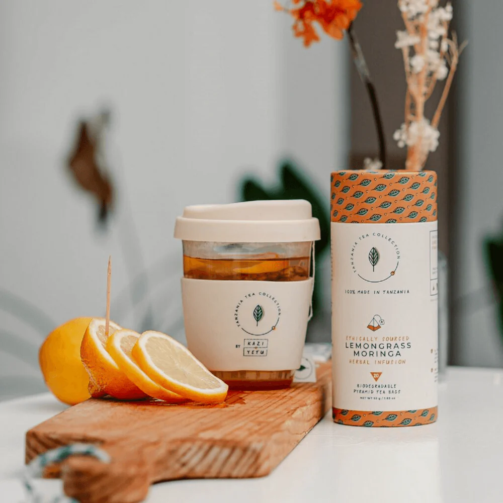 Awaken your senses with Kazi Yetu Lemongrass + Moringa Herbal Infusion, made from 100% Tanzanian-grown dried lemongrass, organic moringa leaves, and fragrant fennel seeds. This caffeine-free blend gently calms the body and supports digestion while offering a light, herbaceous taste with earthy undertones